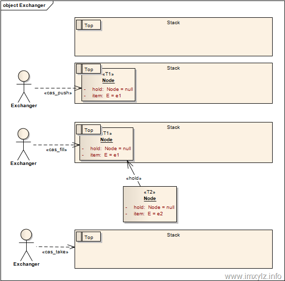 在上面的模型中,我们假定一个空的栈(Stack),栈顶(Top)当然是没有元素的。同时我们假定一个数据结构Node,包含一个要交换的元素E和一个要填充的“洞”Node。这时线程T1携带节点node1进入栈(cas_push),当然这是CAS操作,这样栈顶就不为空了。线程T2携带节点node2进入栈,发现栈里面已经有元素了node1,同时发现node1的hold(Node)为空,于是将自己(node2)填充到node1的hold中(cas_fill)。然后将元素node1从栈中弹出(cas_take)。这样线程T1就得到了node1.hold.item也就是node2的元素e2,线程T2就得到了node1.item也就是e1,从而达到了交换的目的。